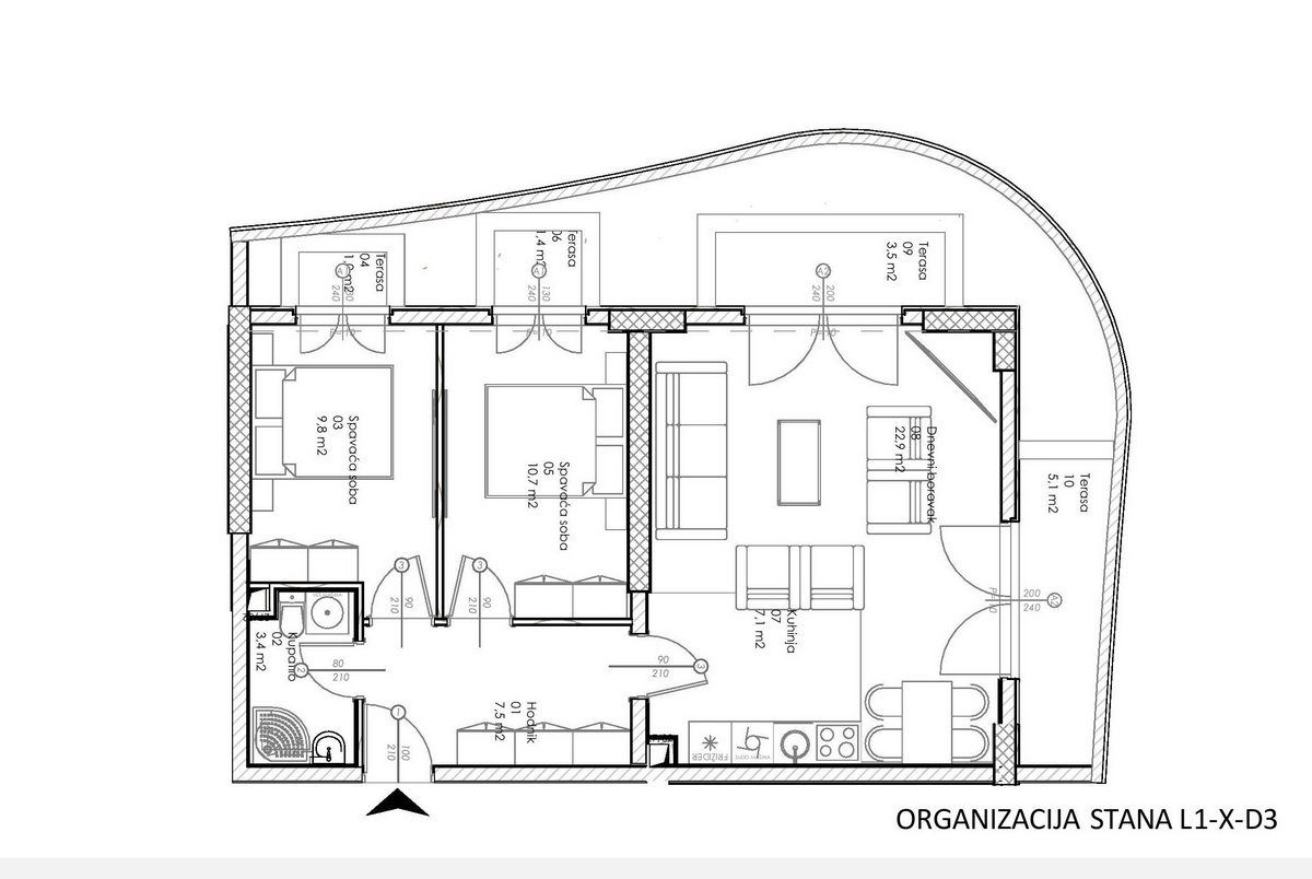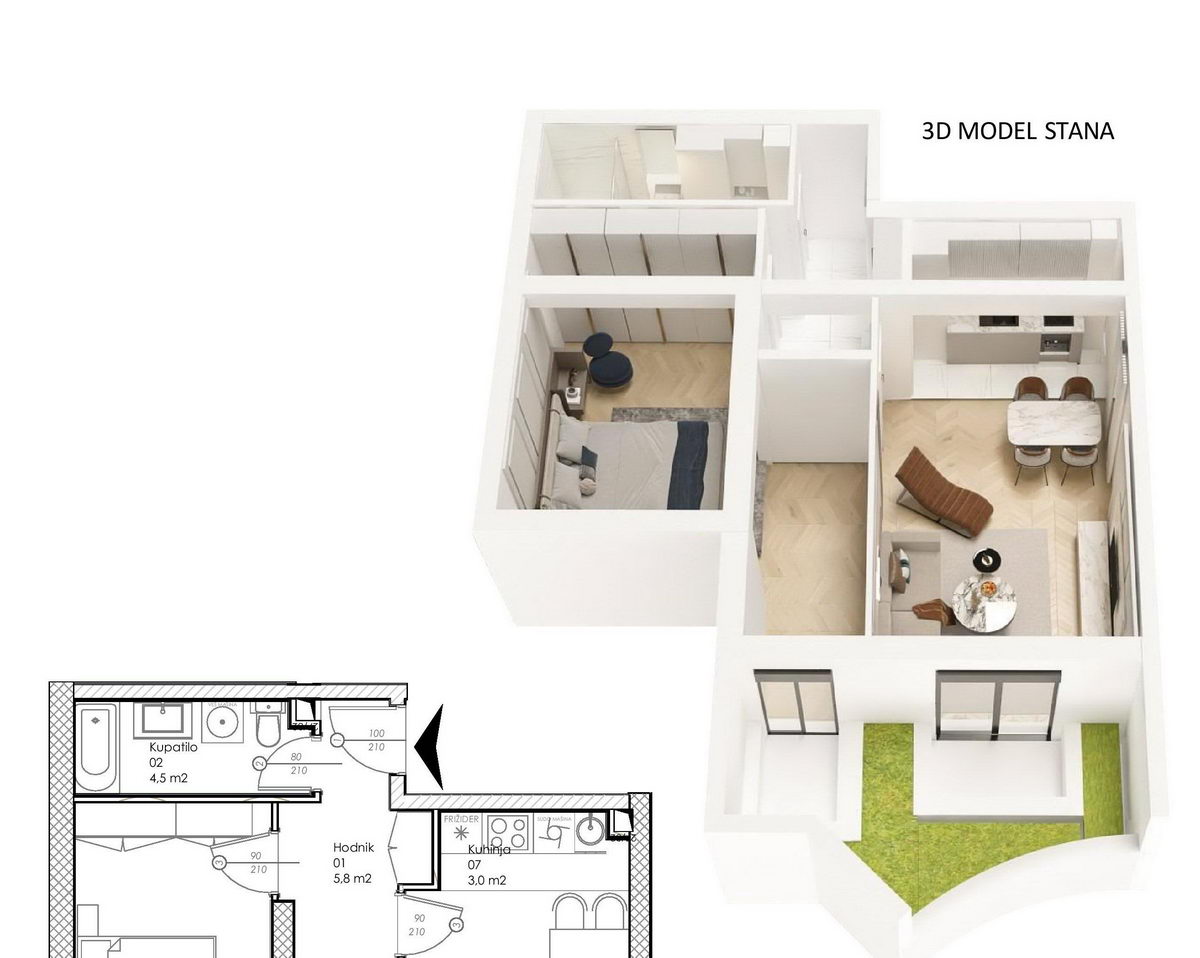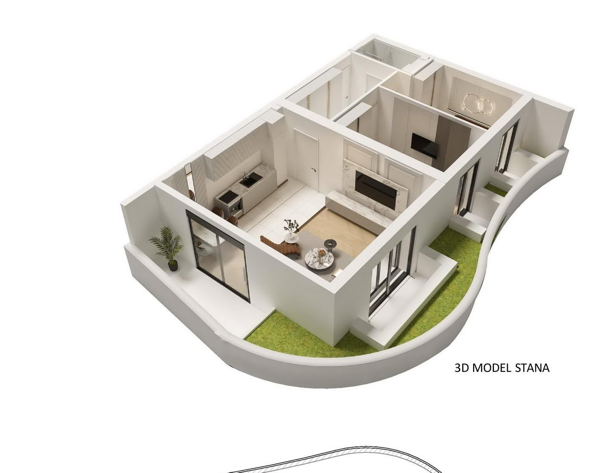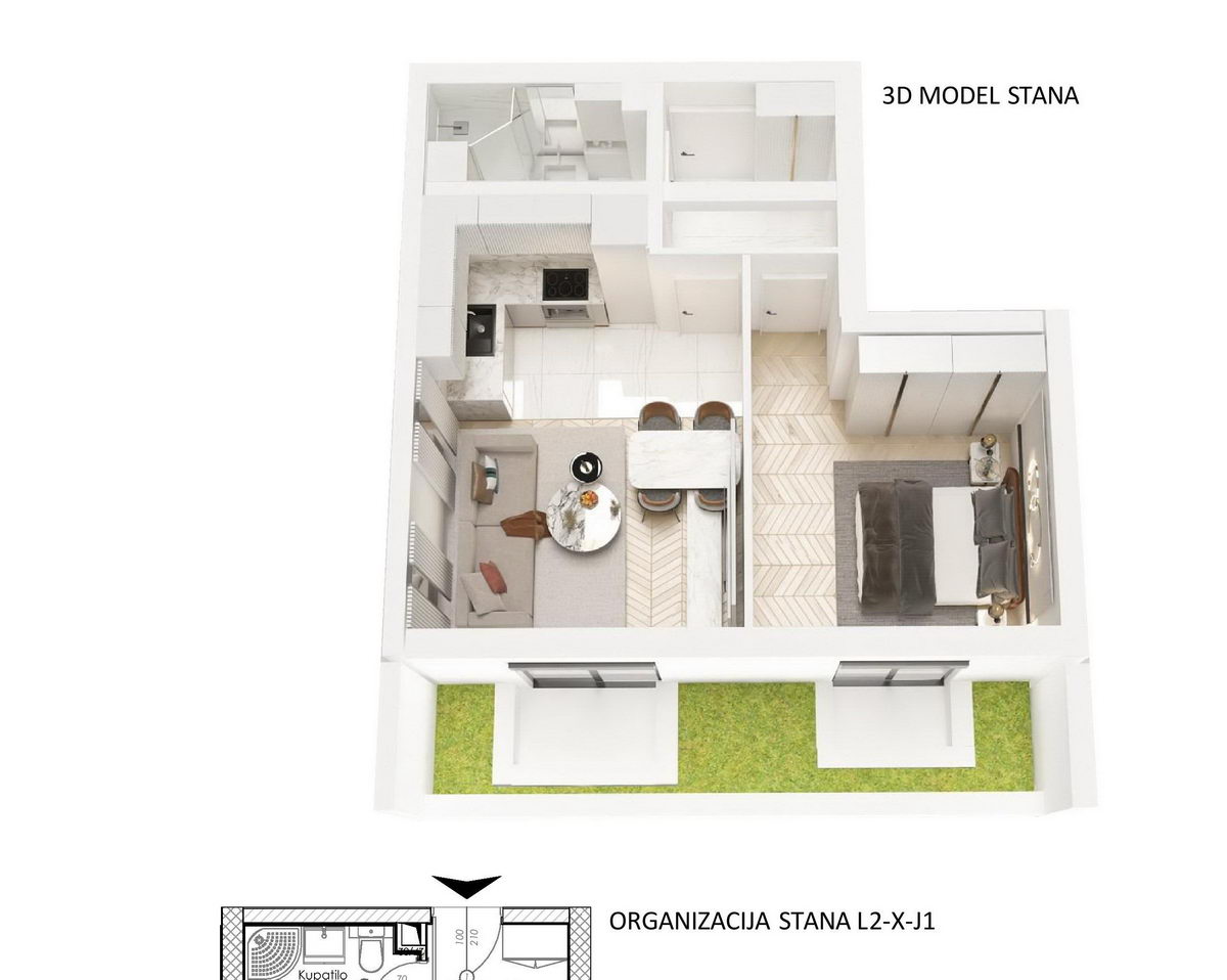 Stan ima dnevni boravak, kuhinju, kupatilo i dvije spavaće sobe.