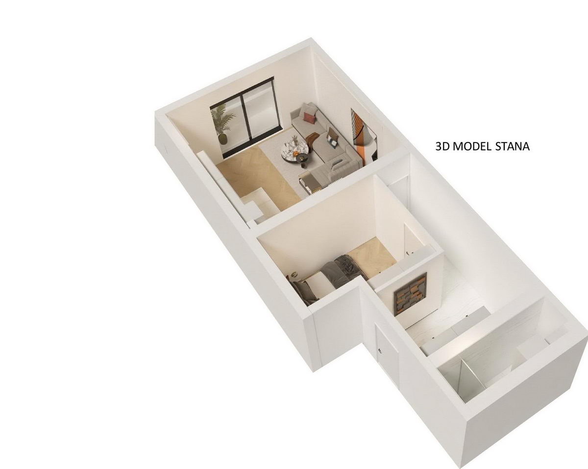 Stan ima dnevni boravak, kuhinju, kupatilo i jednu spavaću sobu.
