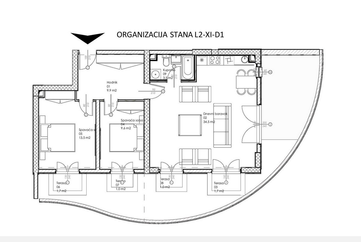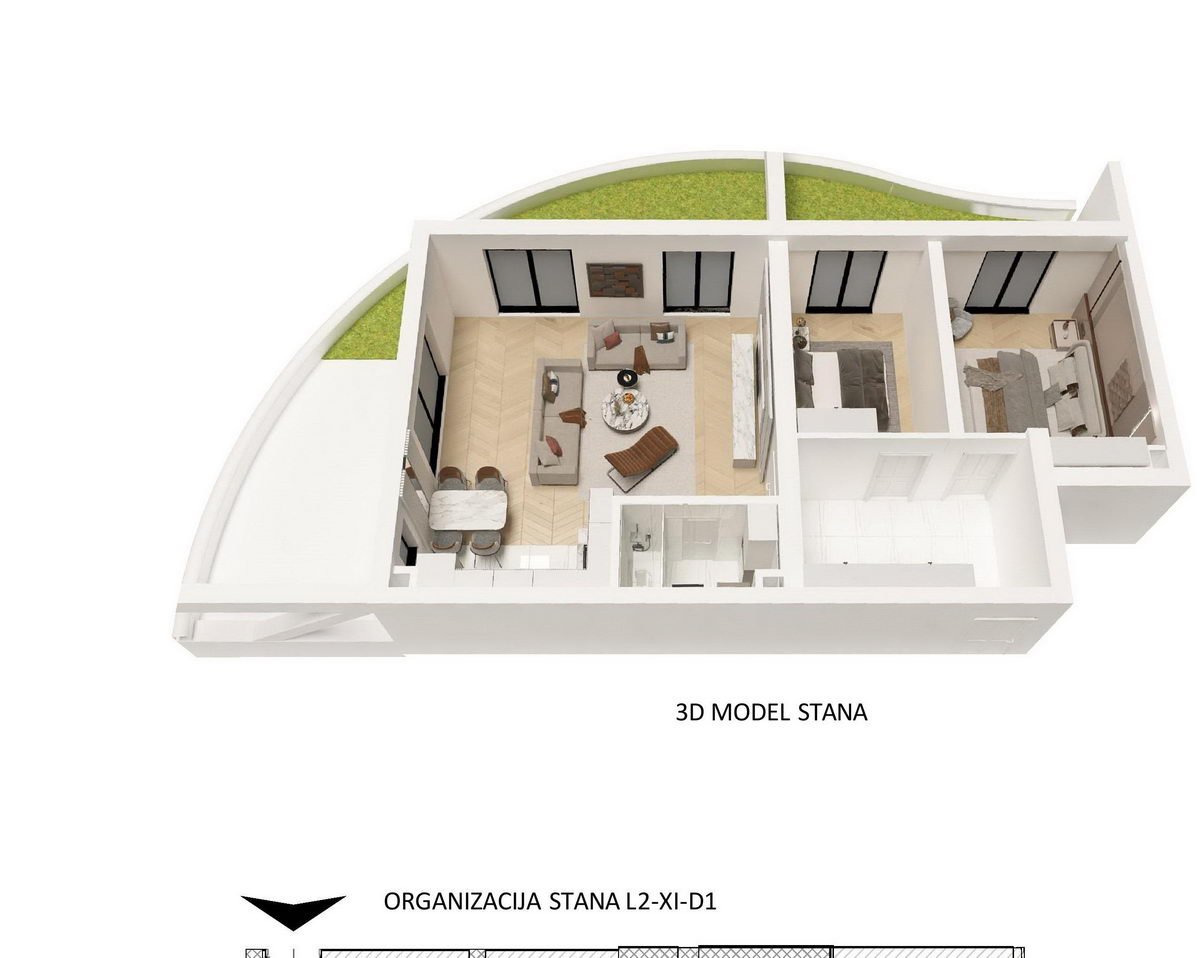 Stan ima dnevni boravak, kuhinju, kupatilo i dvije spavaće sobe.