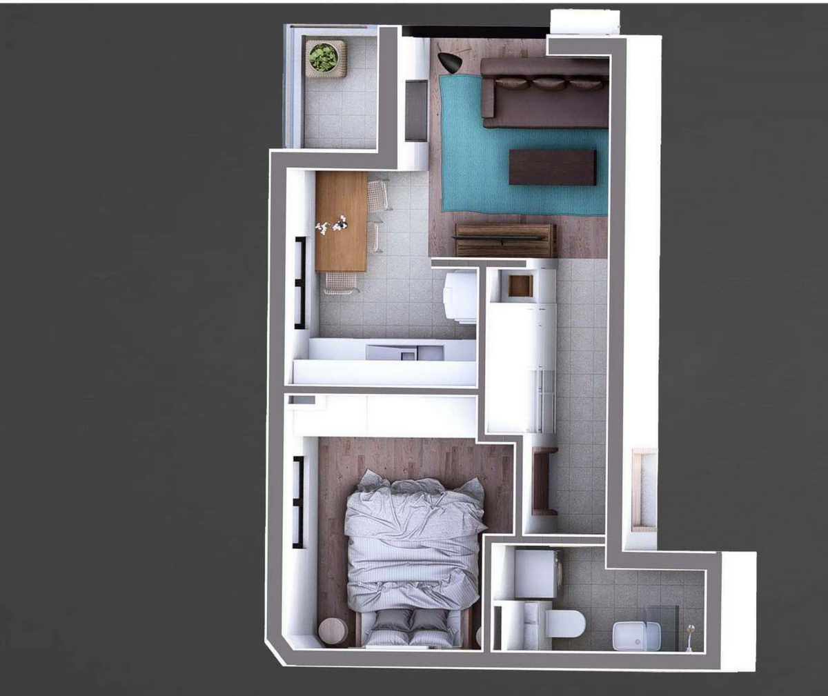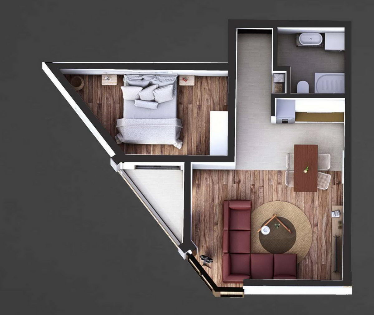 В квартире есть гостиная, кухня, ванная комната и одна спальня.